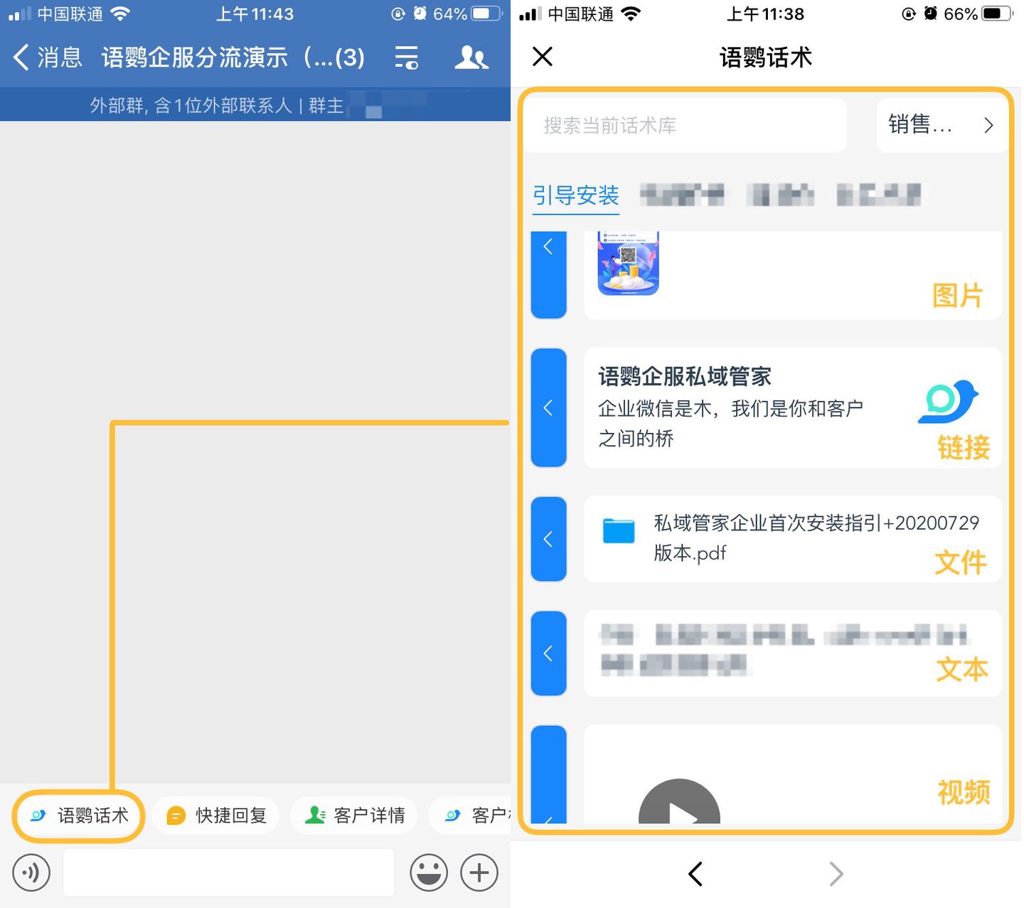 当我们成功与客户之间建立了桥梁后,就需要对客户进行日常维系了,既要及时响应客户更要用专业的态度解答客户的疑问。这时候可以使用语鹦企服的“聊天增强”功能——话术库,话术库支持多种话术形式和内容,并可快捷搜索发送,帮助员工提高回复效率。