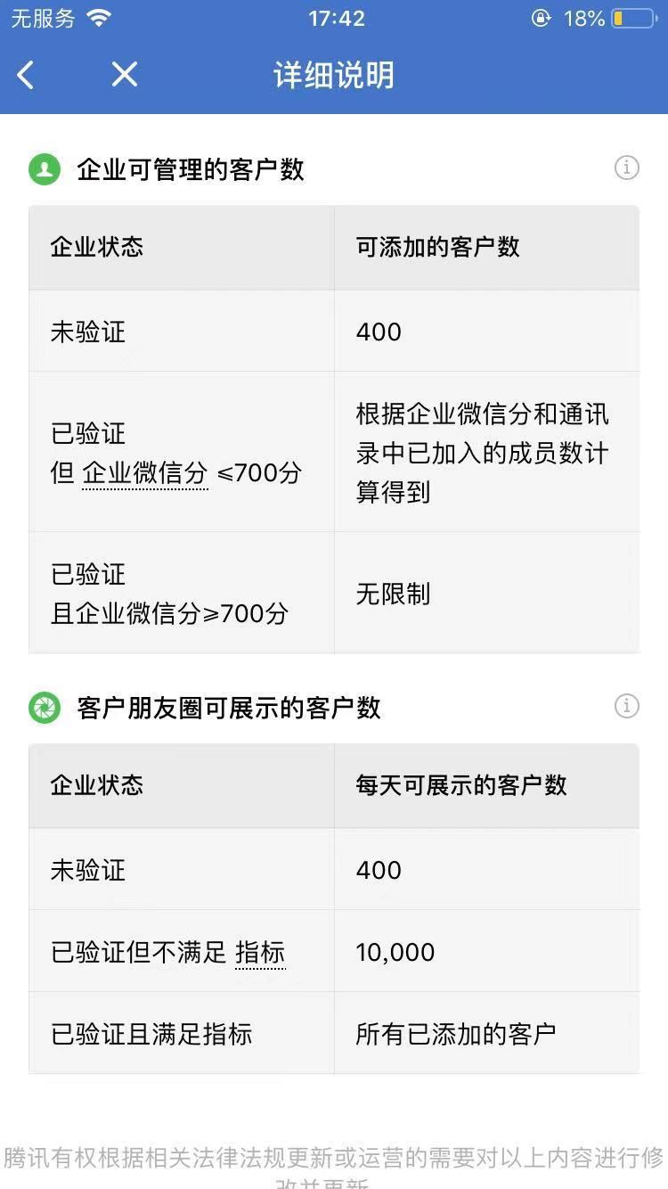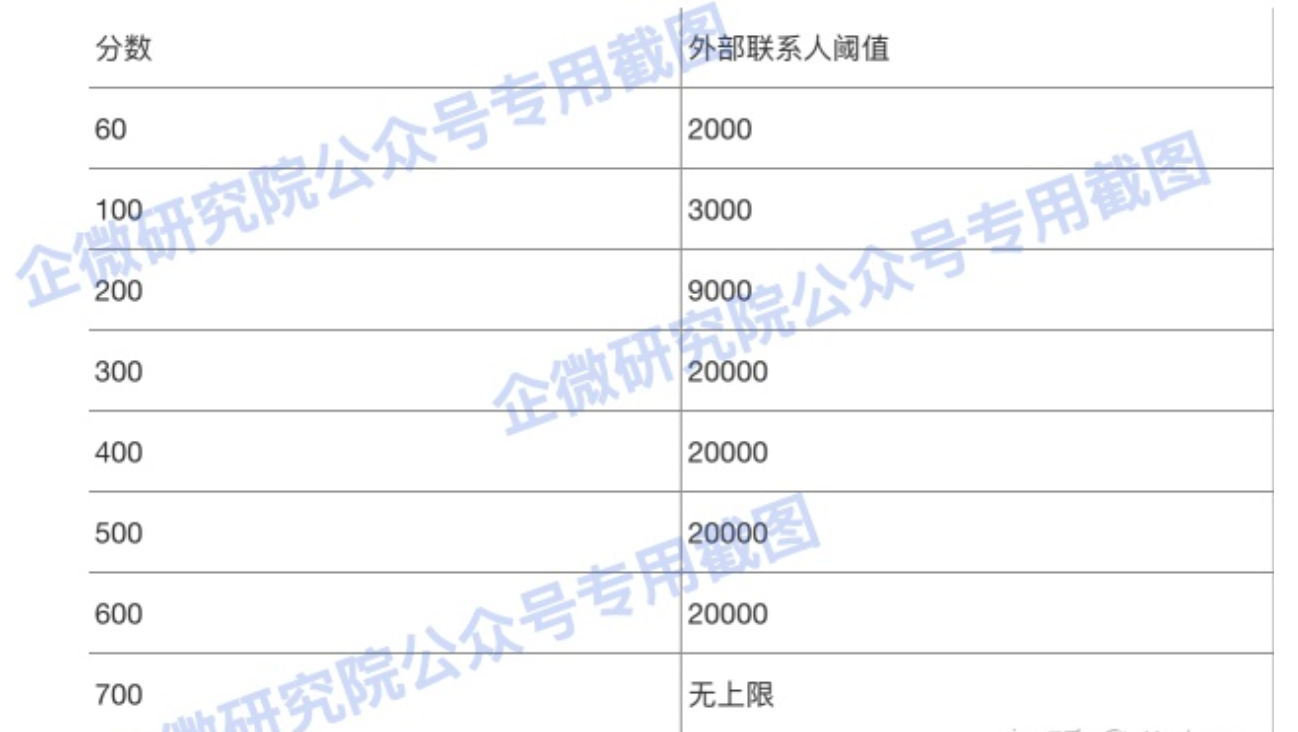 企业微信分对企业的主要影响就是可添加的外部联系人数量,加不了人意味着流量受限,对企业获客和变现是极大的影响。企业微信分有什么等级呢?对应多少外部联系人呢?语鹦企服咨询了部分企业,得知小企业的分值和外部联系人数量大致关系如下,但也不是绝对的。有些企业之前做过扩容,其企业微信分 300+,却可以加几十万人。