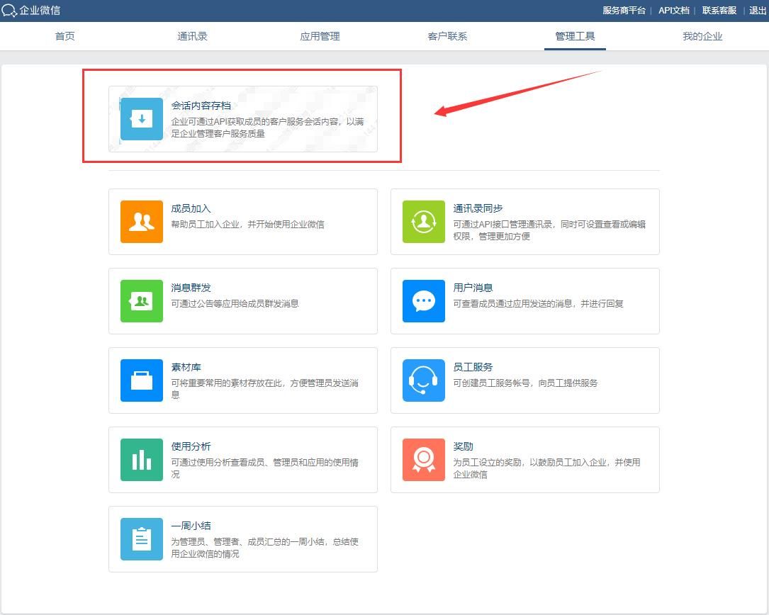 开通「会话存档功能」的方式很简单。企业微信管理员登陆后台,依次点击「管理工具」-「会话存档功能」,就可以购买或者试用了。