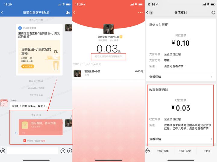 我们领取了别人发的企业微信社群红包后,红包的钱将会存进绑定的个人微信零钱账户。