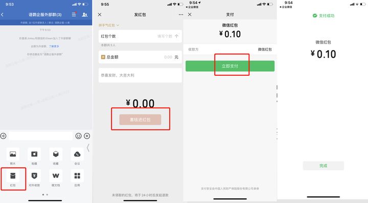 企业微信不管是内部还是外部群,支付方式都是一样的,首先我们打开要发红包的群聊,点击【红包】,输入红包个数、总金额等,点击【塞钱进红包】,页面将会自动跳转到个人微信的支付页面,点击【立即支付】就可以了,企业微信红包的钱直接通过个人微信绑定的银行卡支付。