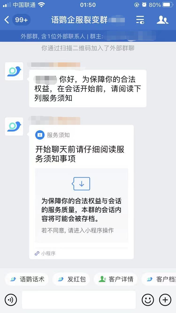 为了保护客户的知情权和隐私权,当企业开通了会话存档功能后,客户与企业员工首次沟通时会出现会话存档的小程序。