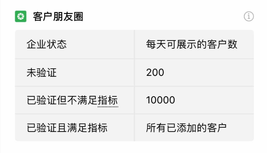 在朋友圈展示客户数方面也根据企业DAU不同而不同,如下图所示,对于未验证的企业,每天可展示的客户数上限是200人,已验证但不满足活跃指标的企业,每天可展示客户数上限是10000人,已验证且满足活跃指标的企业,所有已添加的客户都可以查看到企业发布的朋友圈。