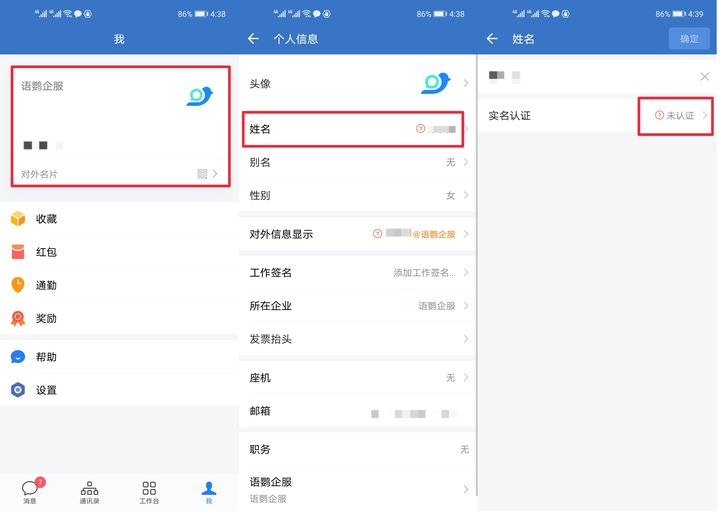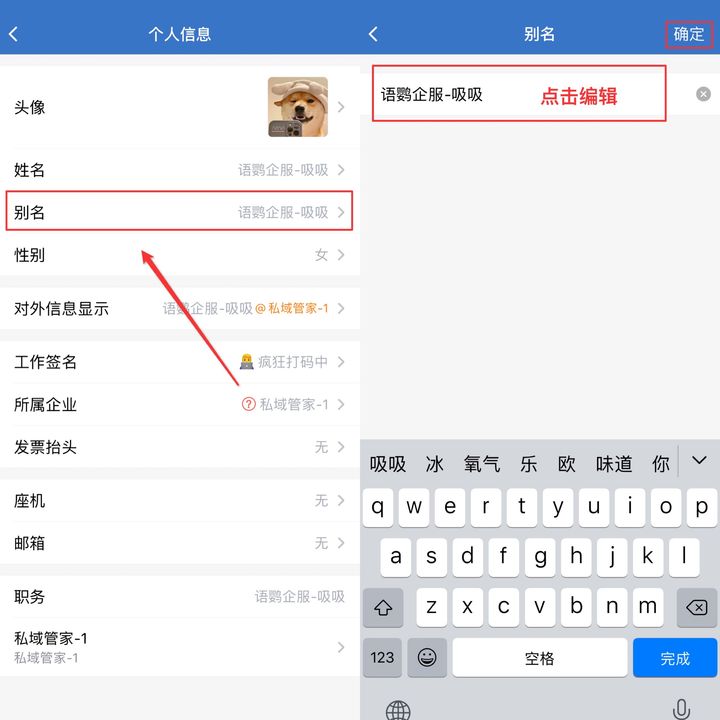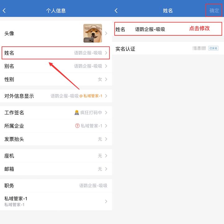如果不想对内显示实名,则可以在我页面点击「头像」-「姓名」,修改完点击「确认」即可对内隐藏实名。
