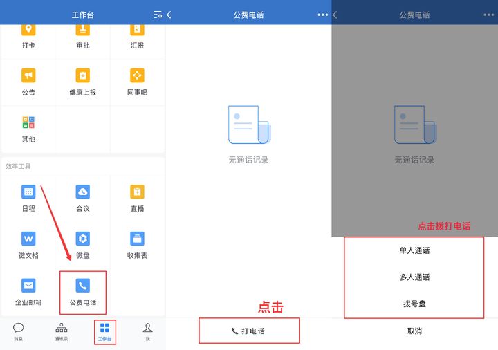 方式一:打开企业微信,在工作台页面点击「公费电话」-「打电话」,点击单人/多人通话或者拨号盘即可拨打电话。