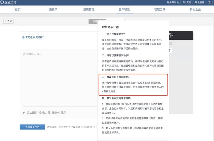 但需要注意的是,每个客户/客户群每天最多只能接收一条群发消息,每个月最多接收来自同一企业的管理员或业务负责人的四条群发消息。