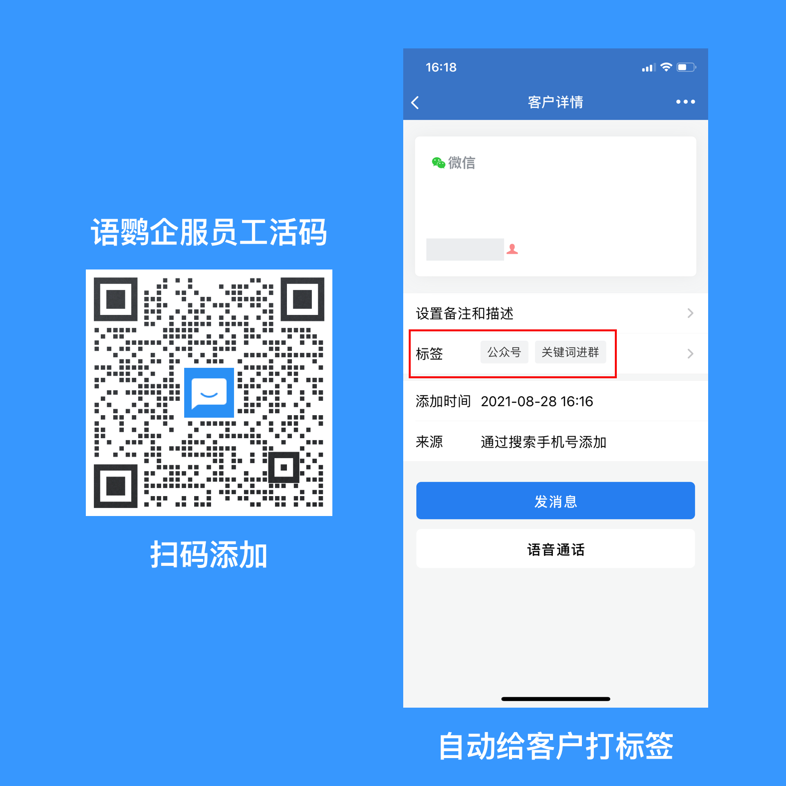 但是,仅仅依靠企业微信根据主观来给客户打标签是不够精准的,而且企业微信目前也无法实现自动打标签。这时我们可以使用语鹦企服事先设置好标签规则,当客户扫描员工活码添加好友后就可以自动给新添加的客户打上后台设定好的标签了。