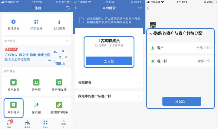 此方法适用于员工离职情况。我们可以使用离职继承功能进行转移。可按如下操作方式:企业管理员打开企业微信App,依次点击【工作台-离职继承-去分配】,选择离职成员的客户/客户群,分配给新成员接替即可。