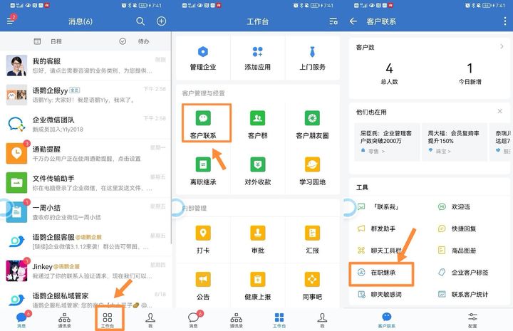 此方法适用于岗位变动情况。我们可以使用在线继承的功能进行批量好友转移操作。企业微信管理员,打开企业微信App,依次点击【工作台-客户联系-在职继承】,进入在职继承页面。