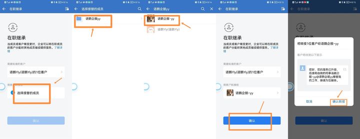 完成上一步骤后,页面会跳回【选择客户/选择接替的成员】页面,此时再【选择接替的成员】,确认该企业接替客户的成员帐号,确认转接即可完成。