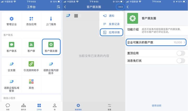 事实上,并不是企业添加的所有客户都可以看到员工发的客户朋友圈,企业发表的朋友圈可展示客户数因企业DAU不同而不同,可展示客户数从”10000人”到”所有已添加的客户”不等,具体可点击【工作台-客户朋友圈】,进入页面后点击右上角三点,进入【应用详情】页面查看到【企业可展示的客户数】。