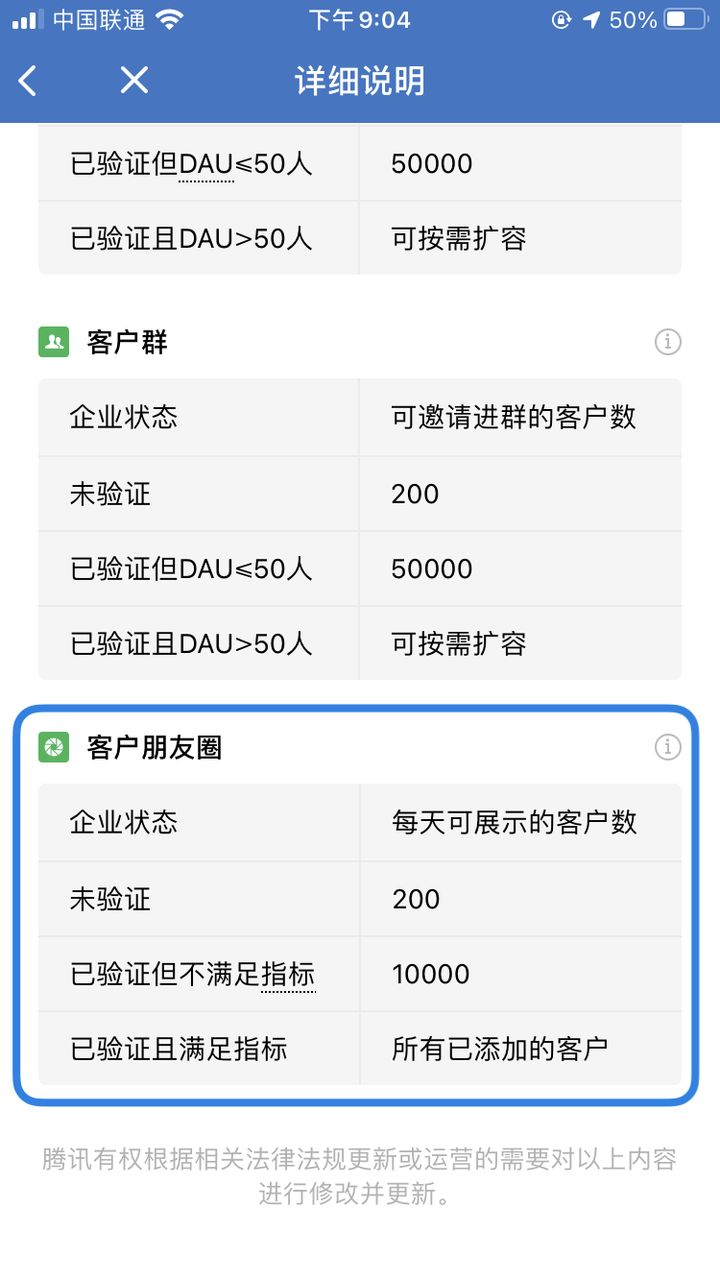 对于未验证主体信息的企业微信最多可展示朋友圈客户数为200人,已达标但不满足指标时,朋友圈最高可展示10000人,若已验证且满足指标,则朋友圈可展示给所有已添加的客户。