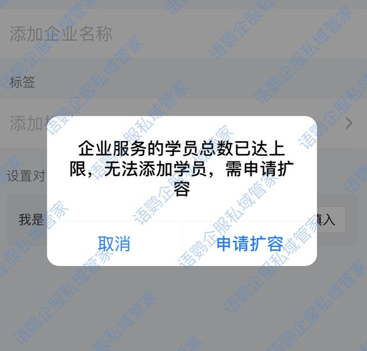 那么对于没有50名员工保持活跃,客户数又已经达到上限,没法添加客户的企业要怎么办呢?语鹦企服提供了一项协助扩容服务,如图所示,客户申请扩容时,提示「扩容失败」,经过语鹦企服私域管家的协助指导,很快成功扩容,如果您也有扩容的需求,欢迎联系语鹦企服工作人员。