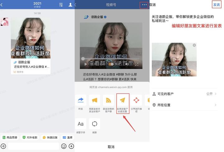 第二步:在手机端的企业微信聊天框中打开该视频,点击该视频的右上角进行转发,选择「发表到客户朋友圈」,编辑好朋友圈文案后点击「发表」