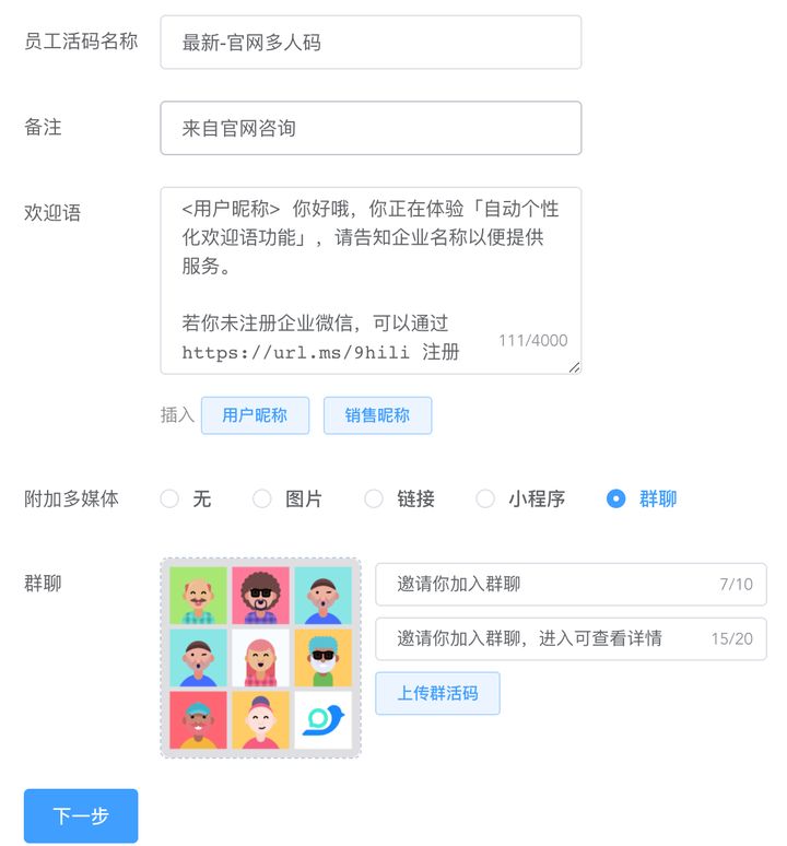 员工活码同样支持发送文本+图片/链接/小程序/群聊(独家)等格式欢迎语,文本中可插入客户昵称和销售昵称,显得更加真实亲切。