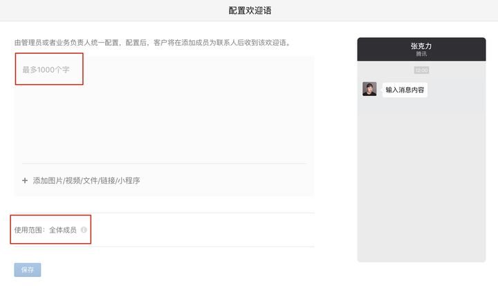 目前来说,企业微信并不支持发送欢迎语时,针对不同客户在欢迎语中不同的@客户昵称,且企业管理员设置的欢迎语使用范围是「全体成员」,也就是说,不同部门不同员工之间,给客户发送的欢迎语可能是一样的。