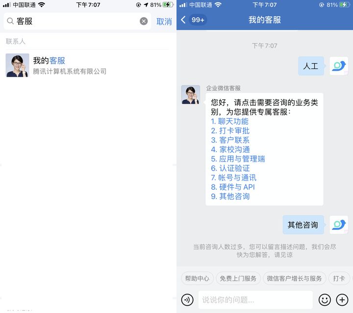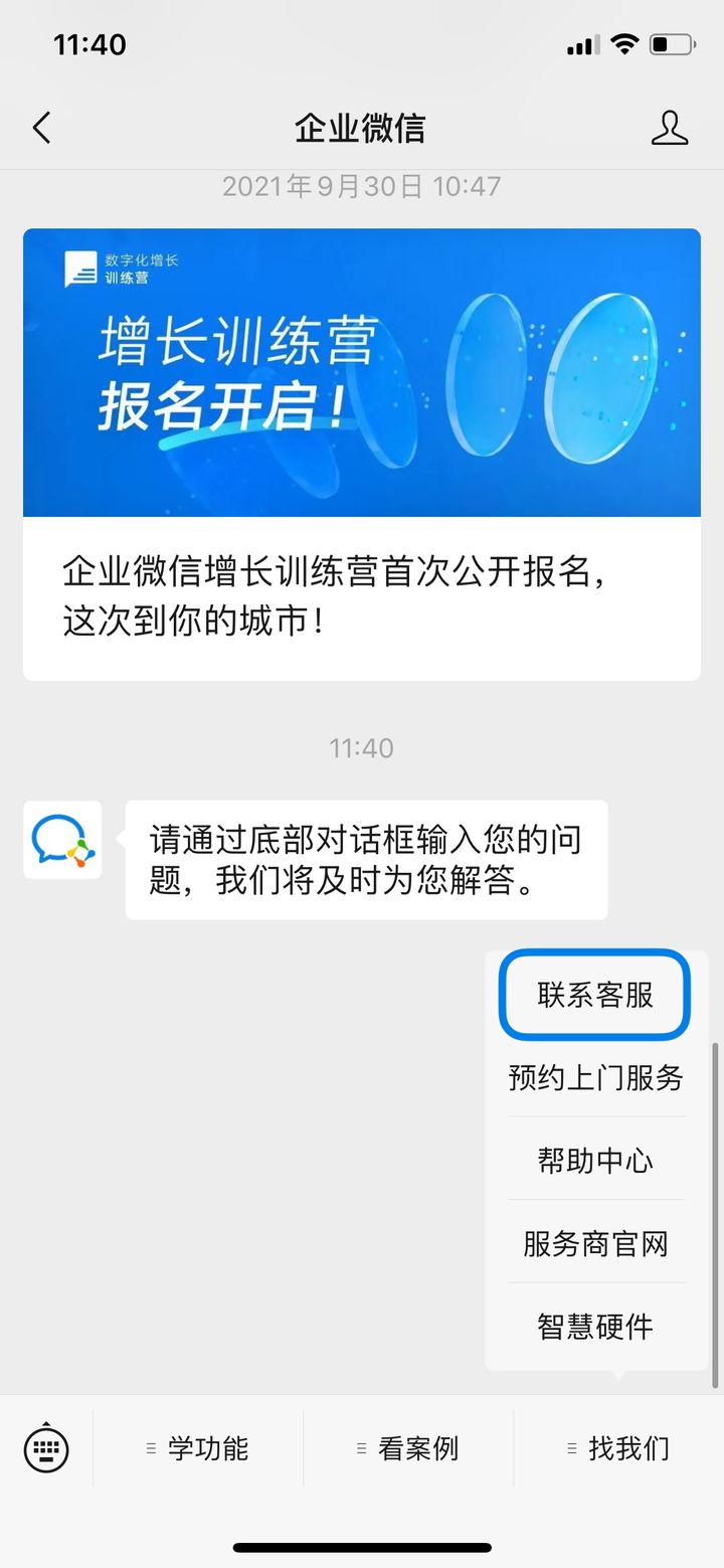 如果是管理员帐号被封号,那就比较麻烦了,封号后管理员不能再登录企业微信App,也无法在企业微信App上联系人工客服,此时可以到企业微信官方公众号上联系客服。