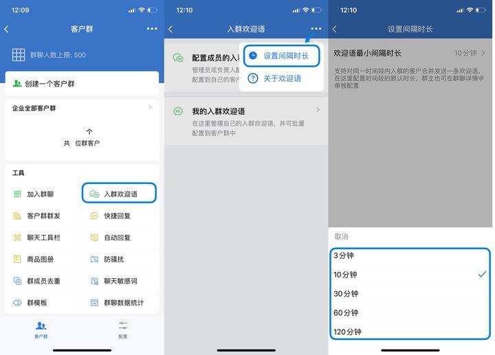 另外,初始状态下,「入群欢迎语最小间隔时长」为10分钟,管理员或群主可打开工作台,依次进入【客户群-入群欢迎语】页面,点击右上角「···」,【设置间隔时长】,最短间隔为3分钟,最长为120分钟。