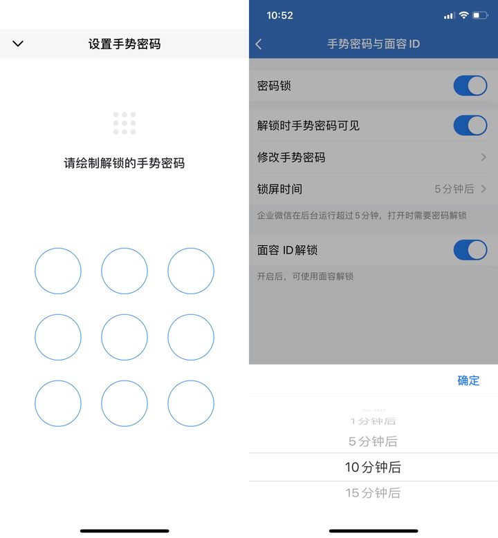 绘制完手势密码后,还可开启「解锁时收拾密码是否可见」、设置「锁屏时间」等。