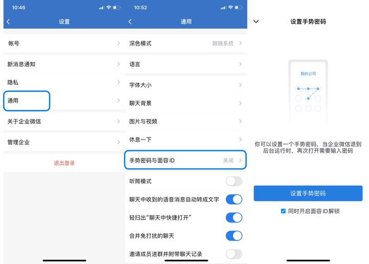 打开企业微信APP,点击右下角【我】,进入【设置】-【通用】界面,点击【手势密码与面容ID】,即可【设置手势密码并同时开启面容ID解锁】。