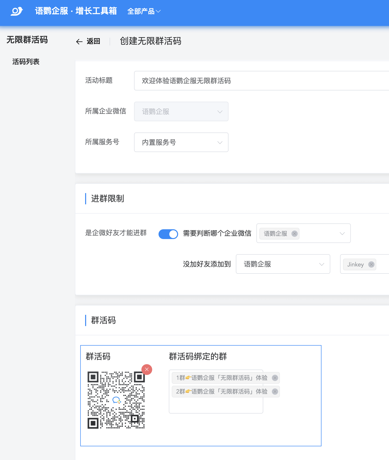 生成无限群群活码的方式也很简单。只需要登录语鹦企服工具箱管理后台,设置「进群限制」并上传「群活码」即可。感兴趣的小伙伴可以联系语鹦工作人员免费体验。
