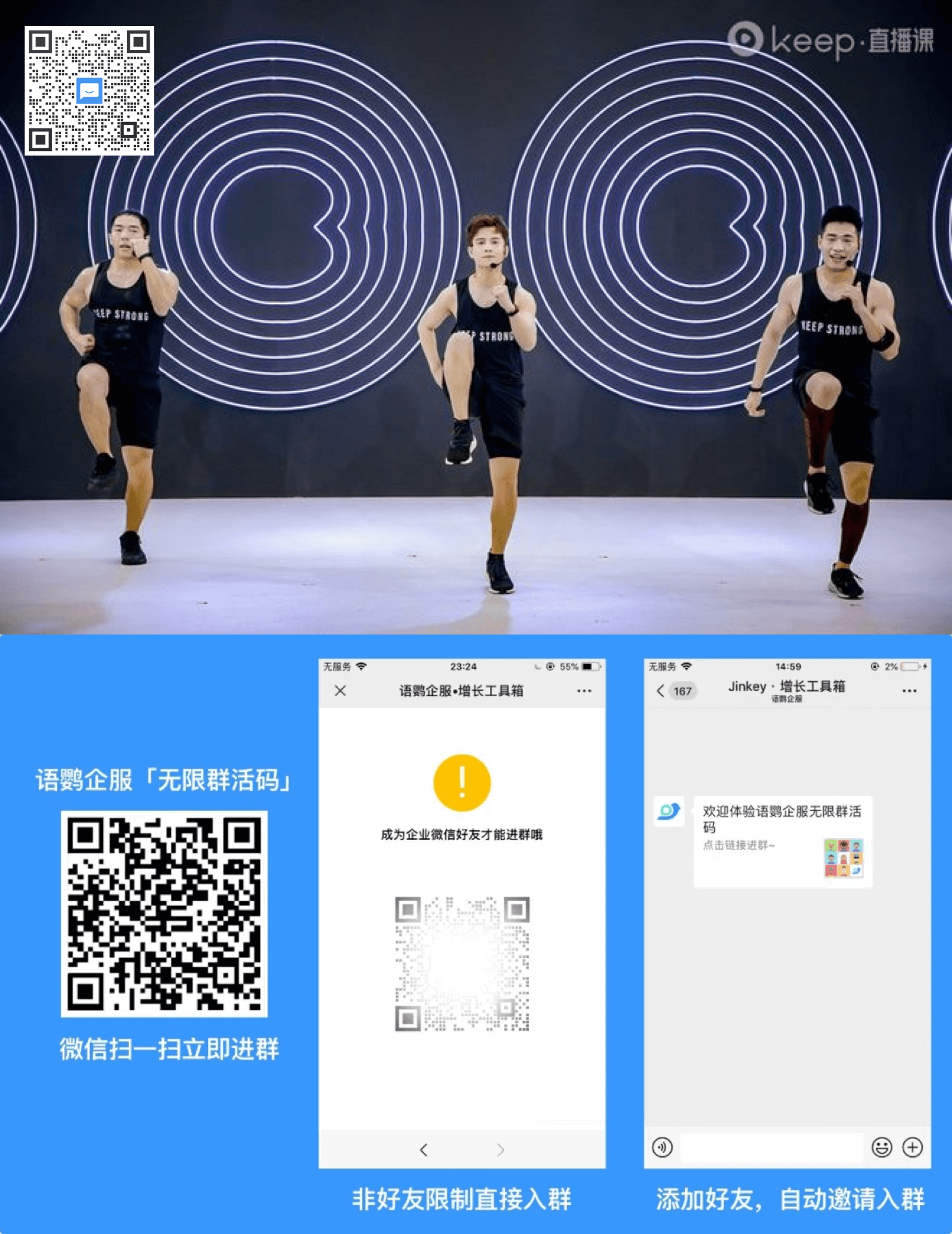 这里推荐使用语鹦企服的无限群活码,如下图所示,主播把无限群活码贴在直播墙上,观众扫码即可入群。如果观众尚未成为该企业的企业微信好友,会自动先引导添加好友再进群,如果已经是该企业的企业微信好友,扫码即可以直接进群。