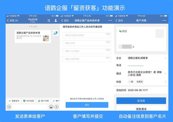在与客户沟通过程中,免不了要了解客户的情况以便做好售后服务,如为客户申请免费试用、了解客户满意度等等。而使用「语鹦企服留资获客」功能,客户填写好信息后就会自动备注到客户名片上,进一步完善用户画像,也便于售后客服直观了解客户情况。