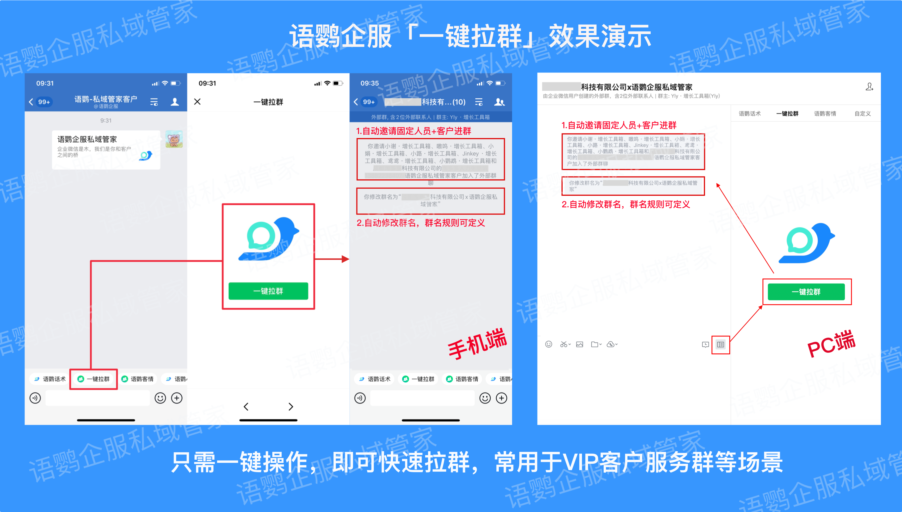 在售后服务中,搭建客户专属沟通群是很常见的操作。一般是针对VIP客户,搭建多对1的售后服务群,如果企业有快速一键拉群的需求,可以使用「语鹦企服一键拉群」功能。