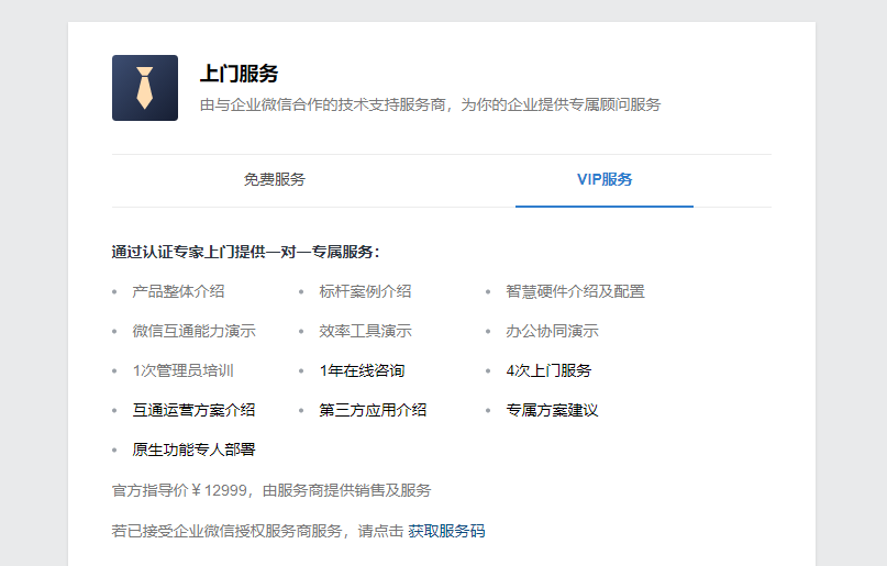 VIP服务相比免费的服务,会给企业提供1年在线咨询、4次上门服务、互通运营方案介绍等更多的一对一专属服务,因此VIP服务也是需要付费的,官方指导价是12999元/年。