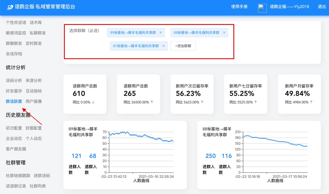 企业也可以结合语鹦企服相关功能进行客户群的监督与管理和私域运营,比如语鹦企服有群活跃度曲线功能,可以自动统计群内数据情况、并自动生成群成员人数曲线。
