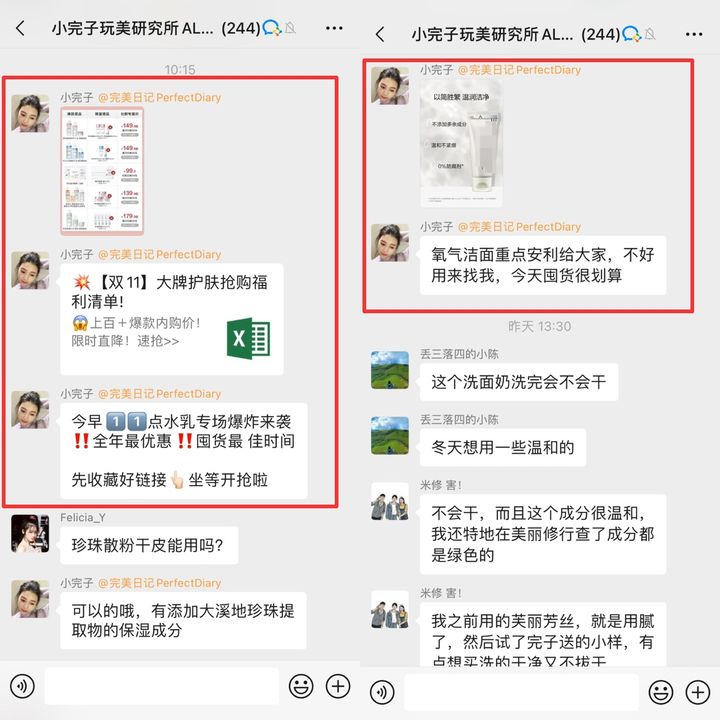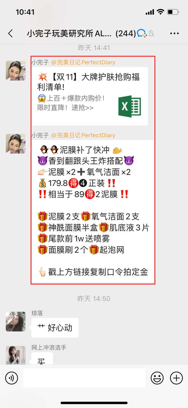 若是服装行业的商家可以选择在换季清仓、节点优惠或者上新的时候进行发单;若是护肤化妆品行业的商家可以每日一更,以图文和优惠链接的形式进行发单。如下图所示,完美日记社群运营就是一个很好的例子。