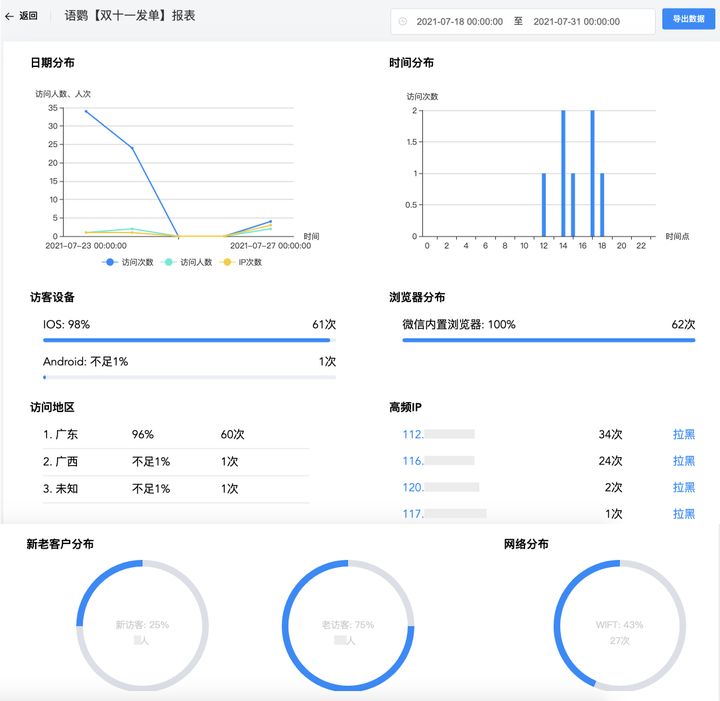结合语鹦工具箱「社群链接跟踪」或「短链」功能,还可以随时对社群成员行为进行跟踪分析,自动生成社群成员查看发单链接报告,以便商家根据统计分析数据去制定和优化下次的营销计划。