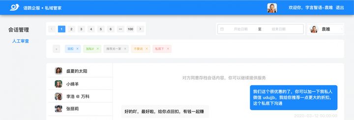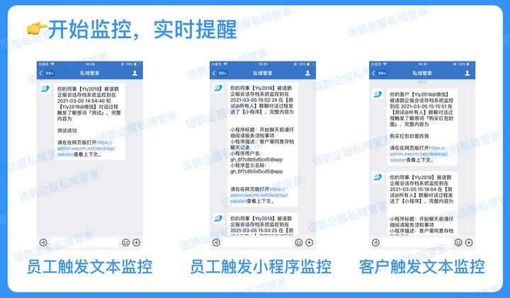 语鹦企服会话存档功能拥有强大的监测能力,可以随时在后台监控员工的工作情况,实时进行提醒,避免员工飞单、私拿回扣等违规操作。感兴趣的企业可以到语鹦企服官网进行了解,届时还可以申请免费体验哦!