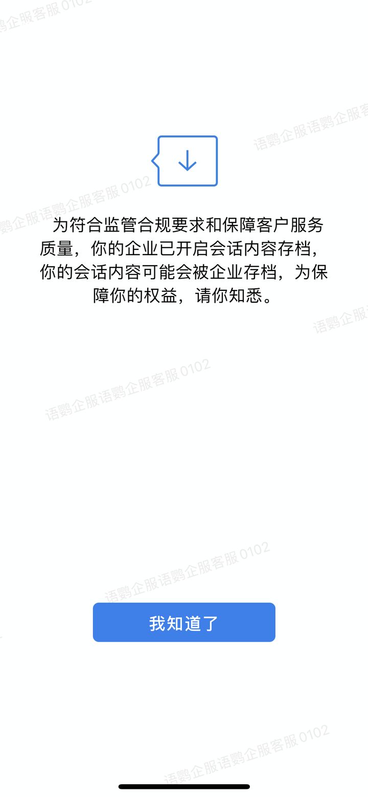 而对于与客户的聊天存档,员工首次添加外部联系人或开通存档后首次向客户发起聊天时,客户则会收到一行会话存档存档的消息提醒,客户默认同意存档,也可以点击「查看服务须知」,选择拒绝存档,具体规则可以联系语鹦企服详细了解。