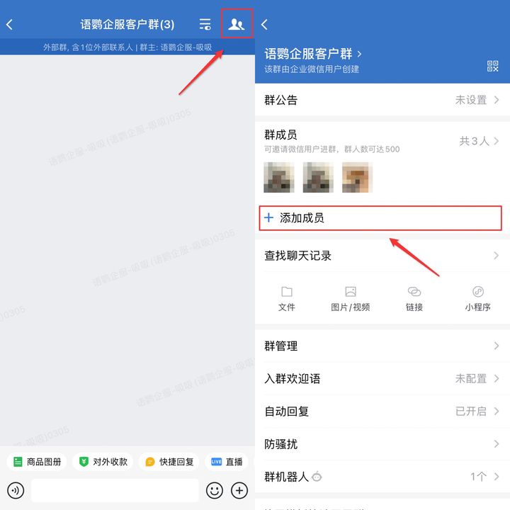 如果对方已经是你的企业微信好友,则在企业微信聊天页面中选择群聊,点击「右上角」-「添加成员」就可以直接拉用户进群。