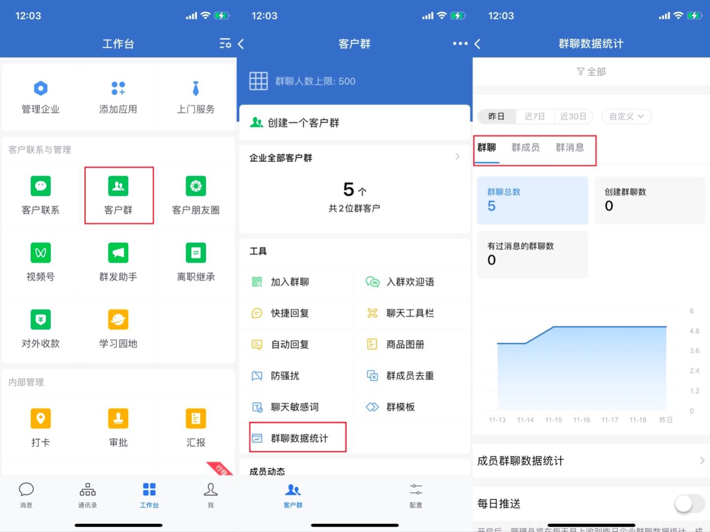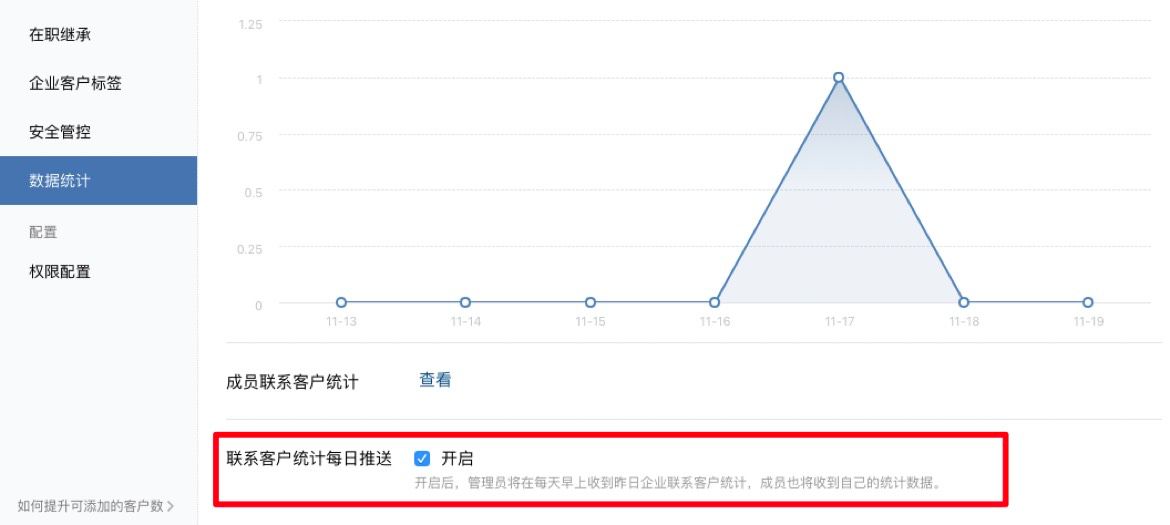 管理员可以在企业微信管理后台「客户联系」-「数据统计」中开启群聊数据统计的每日推送,开启后,管理员每天将收到昨日企业群聊数据统计,成员也将收到自己的数据统计。