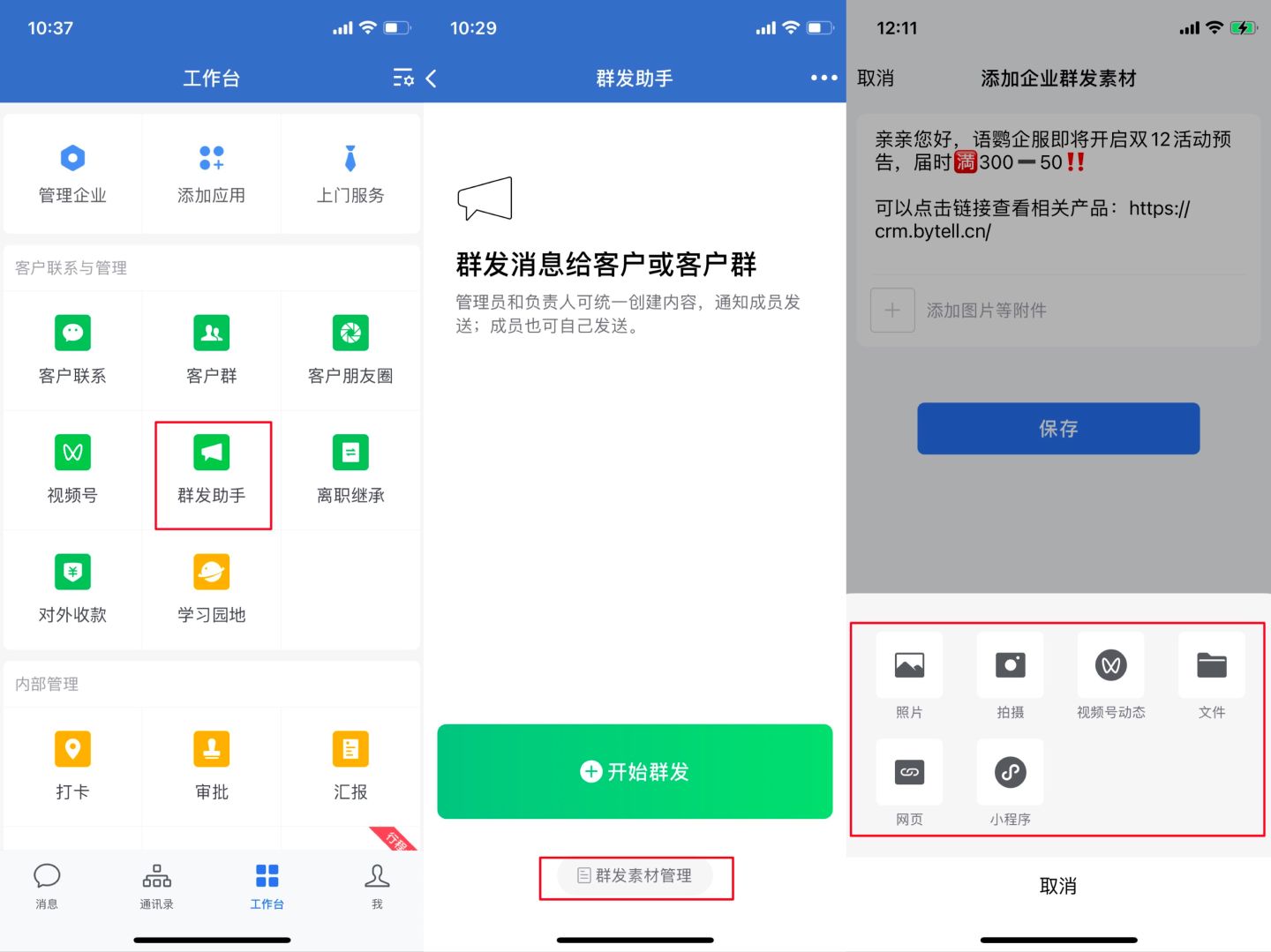 在更新后的企业微信3.1.20版本中,企业可以在「工作台」-「群发助手」入口里可以看到在开始群发下方有「群发素材管理」,其中素材支持图片、视频号动态等附件形式,方便企业员工在群发时直接使用,提高工作效率。