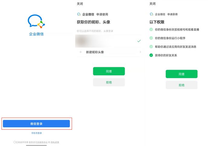 如果你的微信已经实名认证并绑定过手机号,在登录界面,选择【微信登录】,企业微信会请求获得微信的相应授权(其中就包括微信绑定的手机号),同意授权后即可登录成功;