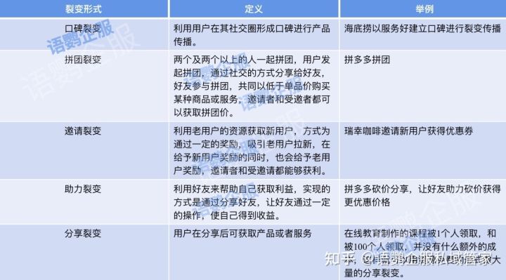 首先,裂变形式要选好,目前主要的裂变形式有口碑裂变、拼团裂变、邀请裂变、助力裂变和分享裂变五种。以下表格为不同裂变形式的定义和举例: