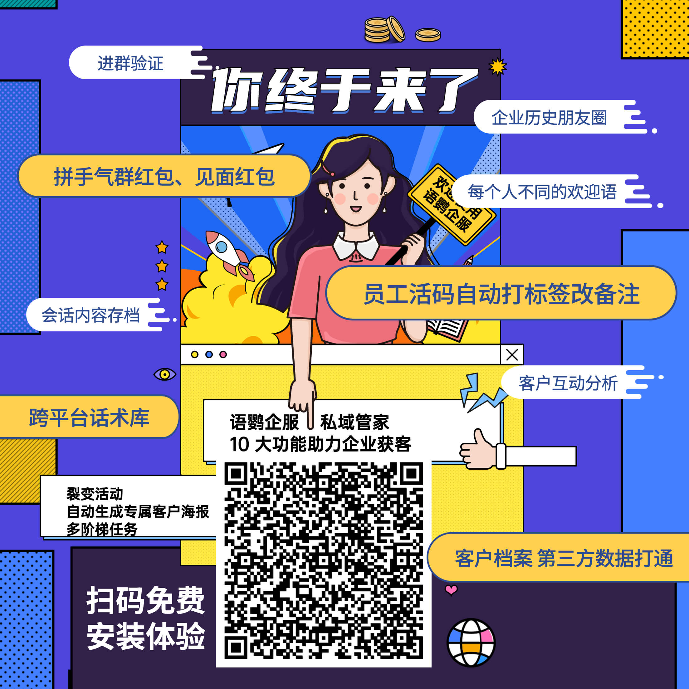 如果你也想借势给你的企业微信引流,就快点来使用语鹦企服工具箱吧!扫码立即免费体验!