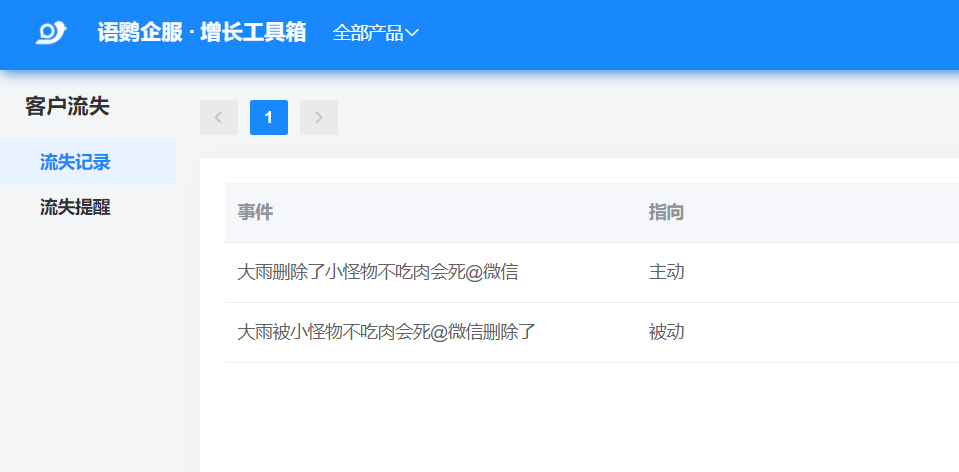 不仅如此,企业管理员还可以在语鹦企服工具箱后台,「客户管理」—「客户流失」模块里查看所有的用户流失记录,方便了解企业客户流失情况。