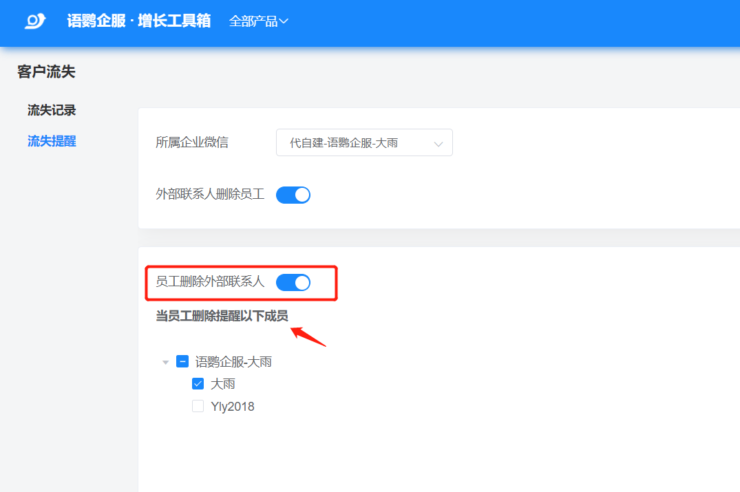 企业可以登录语鹦企服工具箱后台,点击「用户流失-企业微信」-「流失提醒」按钮,进入「流失提醒」页面即可开启客户流失提醒功能。
