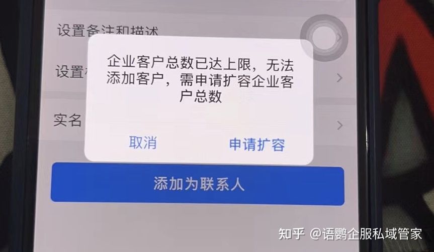 除了清理僵尸粉客户以外,企业还可以通过申请扩容的方式提升客户总量。如果企业微信客户总数超过50000人上限,企业在添加客户时就会收到扩容提醒,点击【申请扩容】可进行扩容。