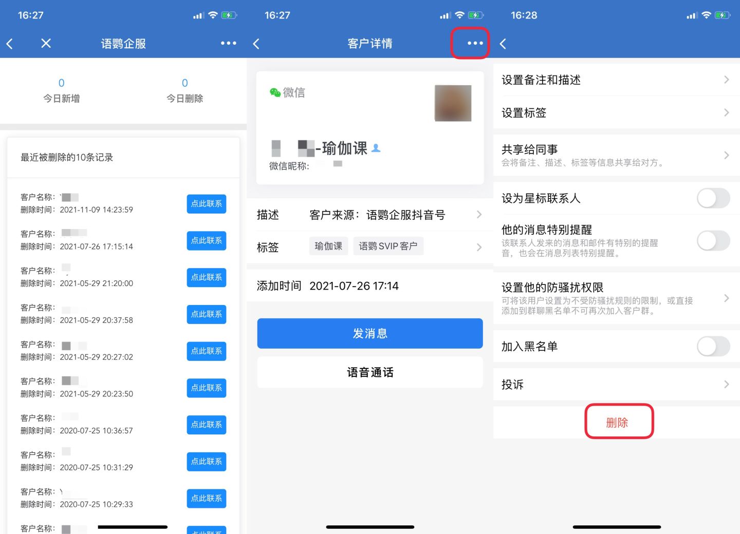 可以使用语鹦企服的【被删提醒】功能,第一时间发现自己被哪些客户删除了好友,及时做出处理措施。