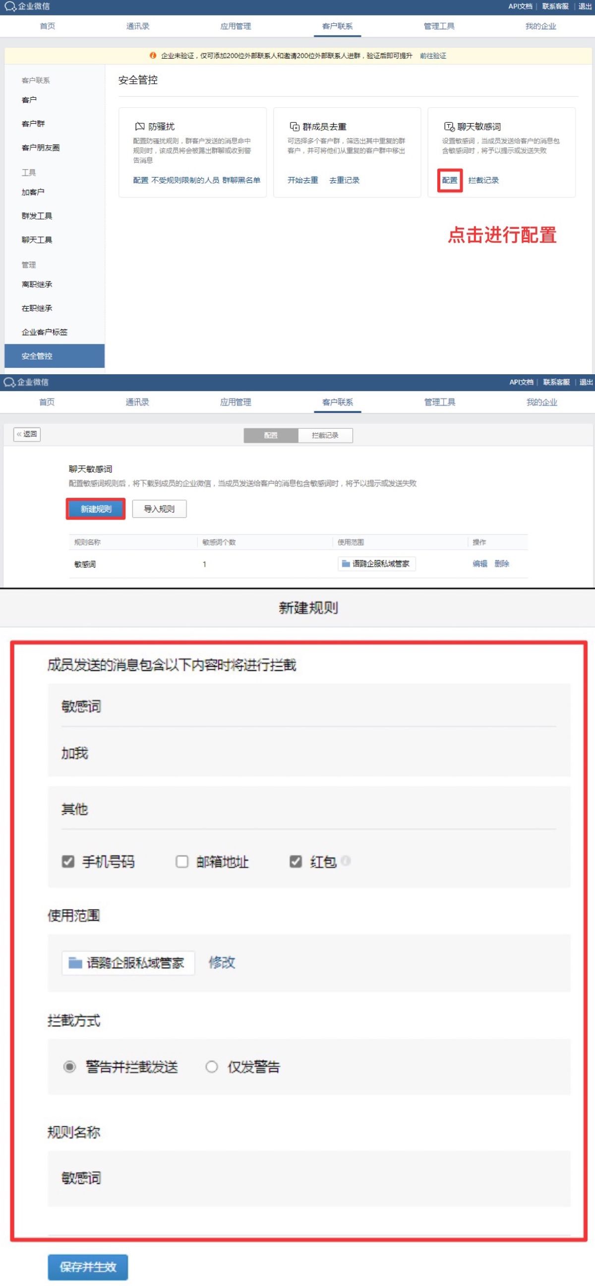 企业微信的敏感词拦截功能是直接可以使用的,不需要开通会话存档功能。