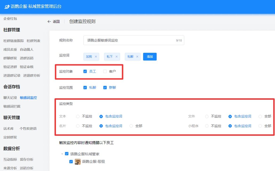语鹦企服的敏感词监控功能的监控对象不仅包括员工,还有客户。