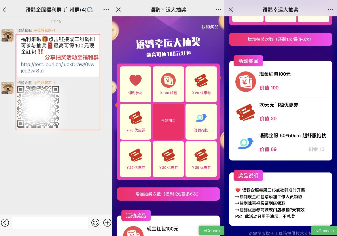 门店也可以在福利群里发布抽奖裂变活动,设置与产品捆绑消费的奖品和到店兑奖的奖品领取方式,引导客户到店消费。