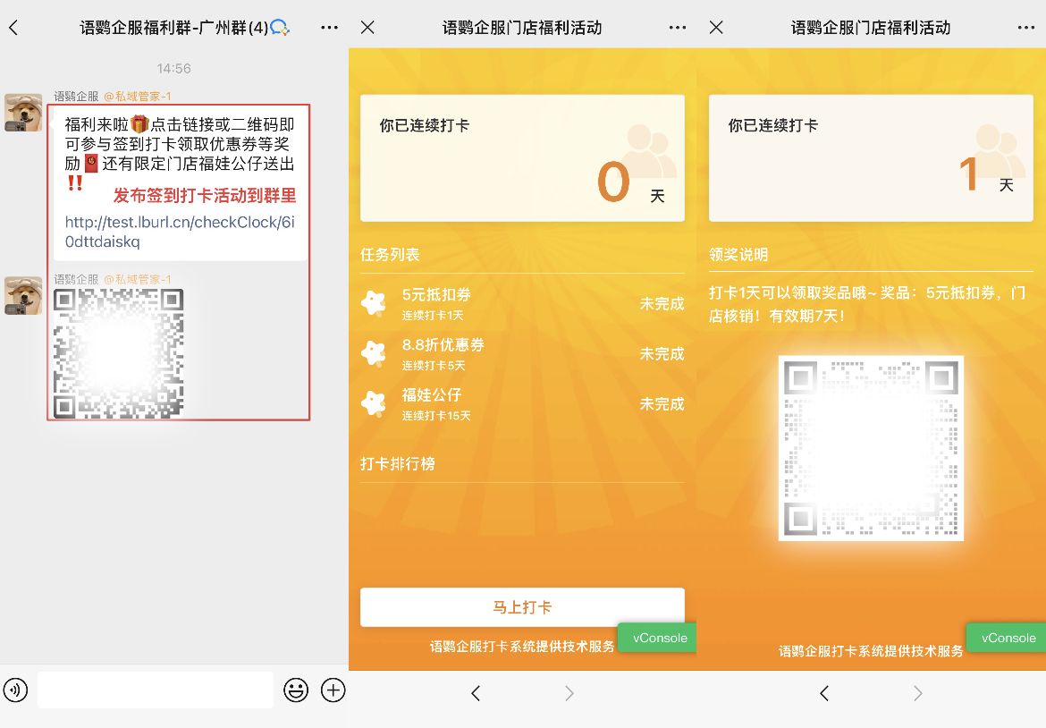 玩法一:发起群签到打卡活动到店兑奖
