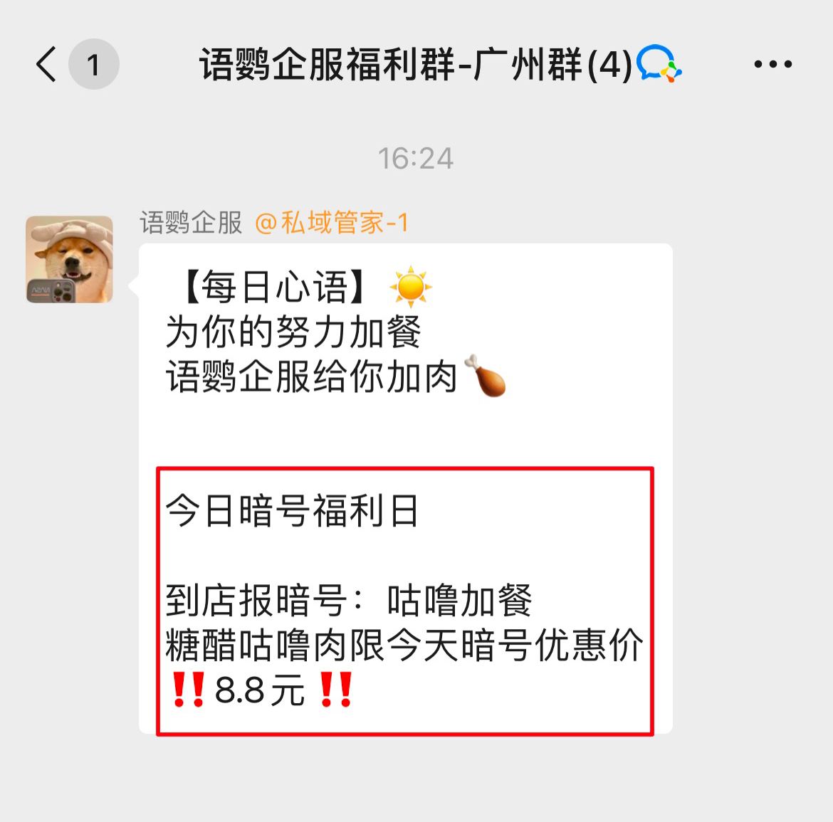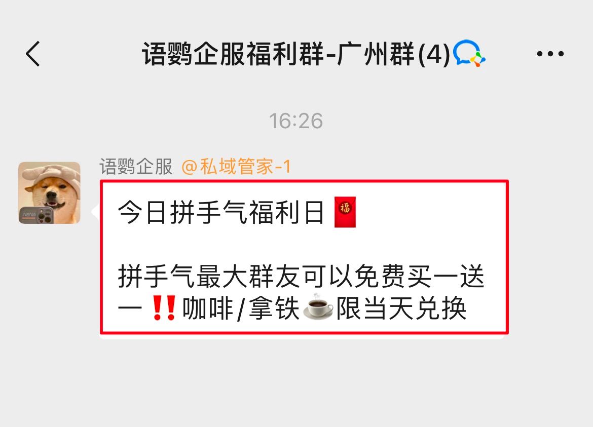 门店可以定时在客户群里发起到店报暗号活动,群成员即可凭暗号到店兑奖或者领取折扣进行消费。