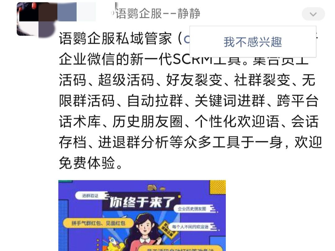 最后,如果在错误的时机过多的朋友圈刷屏,用户难免会因为信息过多、信息重复或者信息单调等原因,屏蔽企业朋友圈信息,当用户第1次点击「我不感兴趣」,7 天内将不再接收企业朋友圈;第2次点击 30 天内不接收,第3次点击后 1 年不接收。